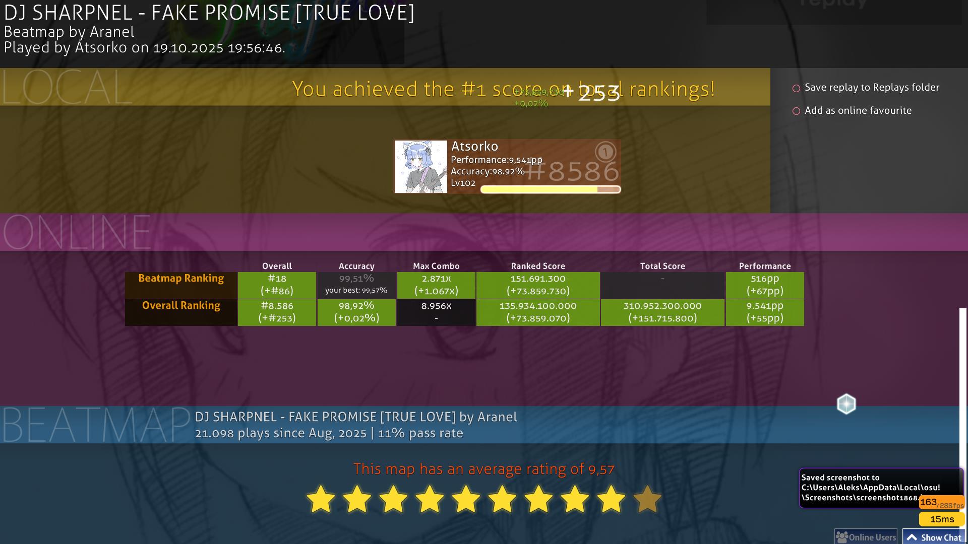 9500pp 19.10.2025 well that took a bit (3 months) but i finally reached 9500pp, i was really inconsistent and usually did low star completion but for some reason today i felt so comfortable with my aim and everything that i set my first 500pp play!! super happy with it being on fake promise which is a banger song! (ly Aranel for mapping it <3)