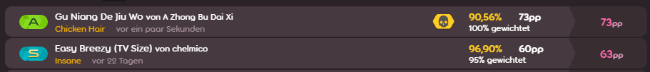 Bubbleman is a very obvious one, insane skill at speed and Tournament play not caring about performance points but more so about all of his cool scores almost checking them off one by one, a cool thing he does is that after a great score like an fc on Yomi Yori he immediately goes to play another map just 21 seconds (i counted them all) after his score.