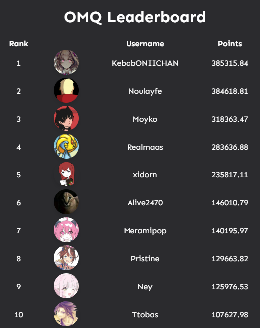 I play a lot of OMQ (osu! music quiz); a song guessing game developed by Luscent. I can play all of the game modes in OMQ but mostly osu!standard. My main inspirations to progress at OMQ are Noulayfe; shizume and Moyko.